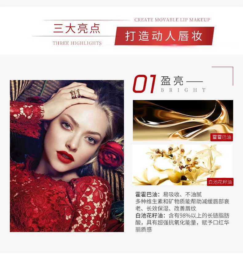 功 效:哑光轻雾感,百搭不干燥,色彩饱满,水润细腻,持久莹亮,食品级色料,是口红,更是护唇宝